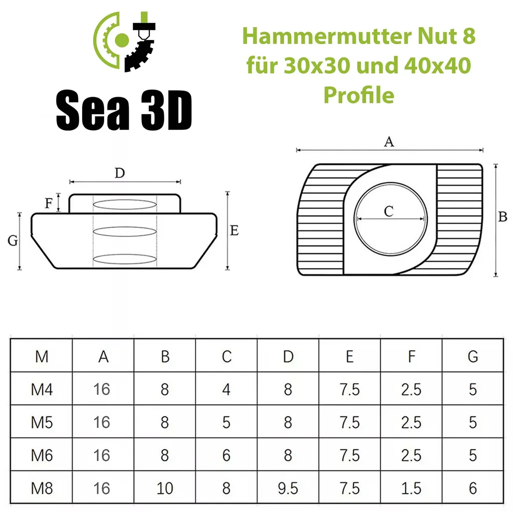 50 Stück Nut 8 Hammermutter, M5 Gewinde 3030 4040 Profil Nutenstein 3D Drucker CNC