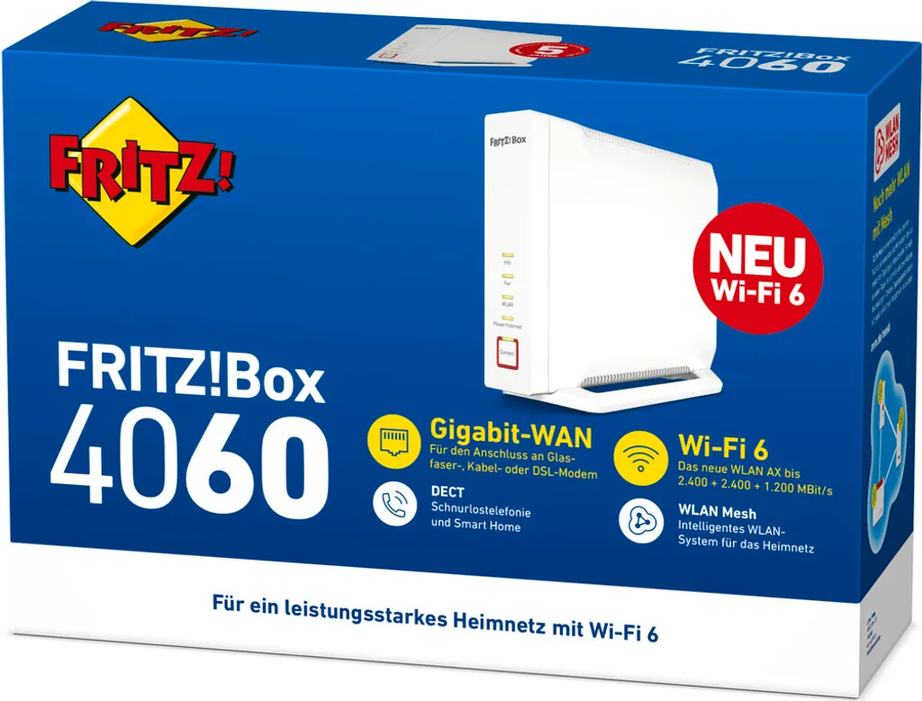 AVM FRITZ!Box 4060 – Wi-Fi 6 (802.11ax) – Tri-Band (2,4 GHz / 5 GHz / 5 GHz) – Eingebauter Ethernet-Anschluss – Weiß – Tabletop-Router