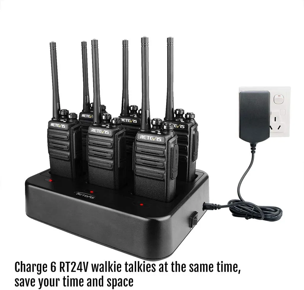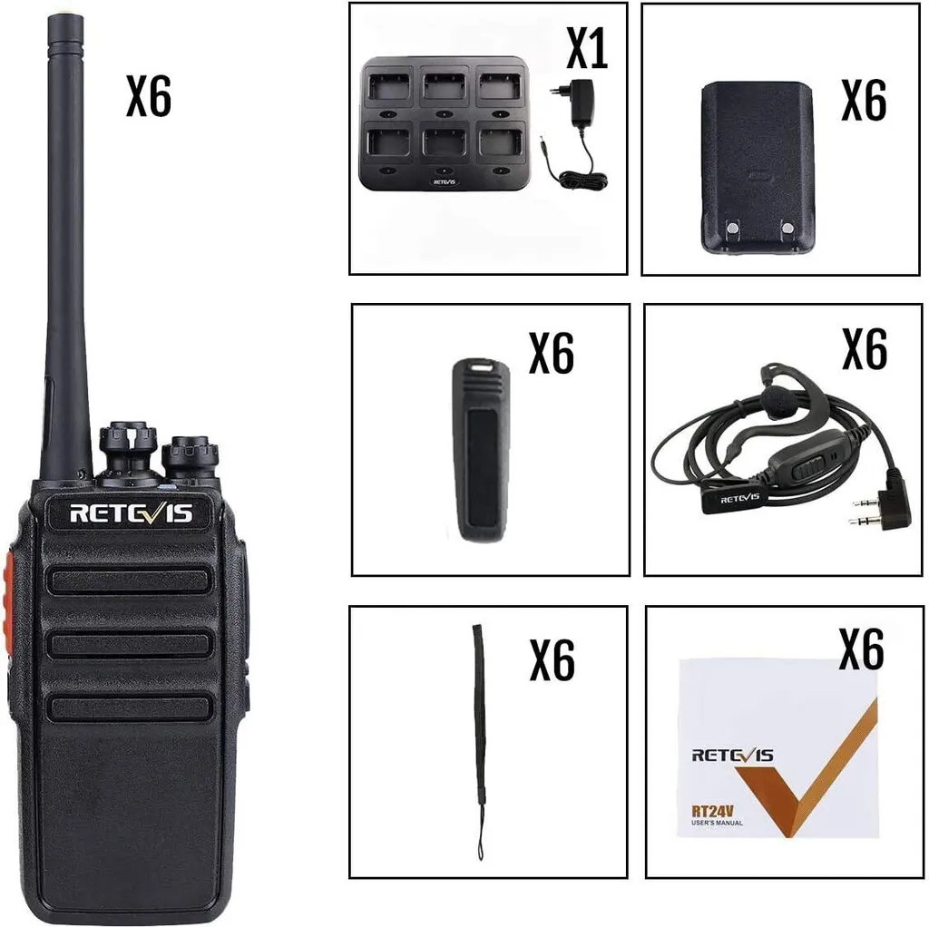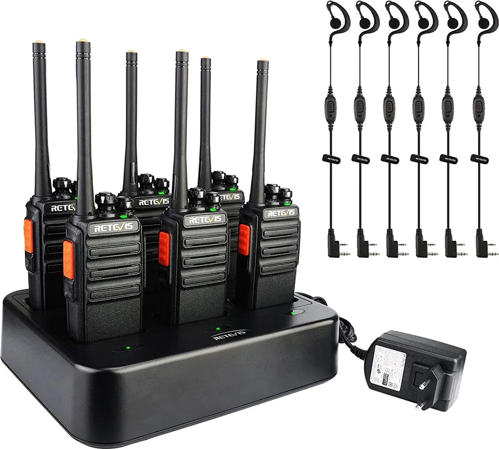 Retevis RT24V Freenet Funkgeräte Set, Professionelle PMR Funkgerät Großer Reichweite, Walkie Talkie Mit Headset 6-Wege-Ladegerät, 6 Kanäle Für Security, Polizei, Veranstaltung(6 Stück, Schwarz)