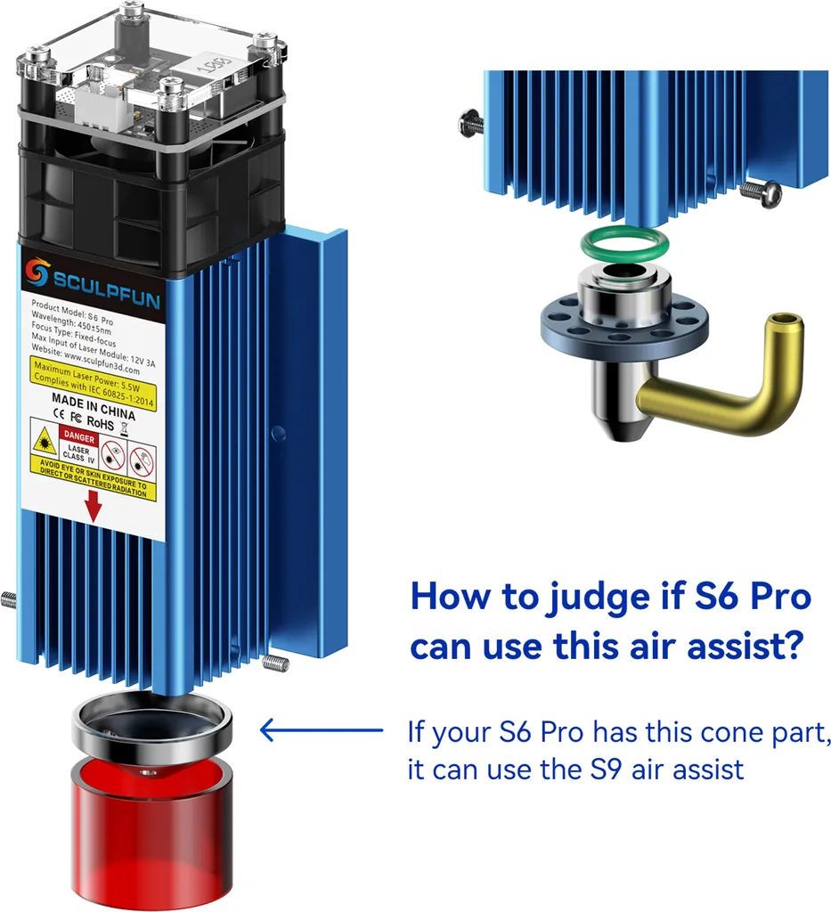 SCULPFUN Air Assist Nozzle Kit Mit 30L/Min Luftunterstützung, Für S9 90W SCULPFUN Graviermaschinen,5W Optischer Leistung Gravier Maschine