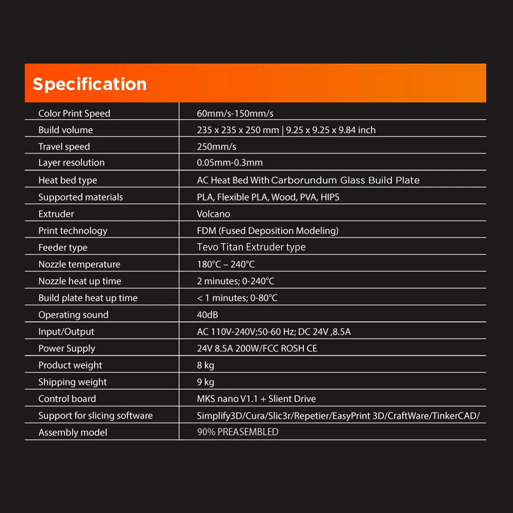 TEVOUP TARANTULA PRO 3D-Drucker 235 X 235 X 250 Mm Bauvolumen Gitterglasplattform RGB-Bildschirm Unterstützung PLA/WOOD/HIPS